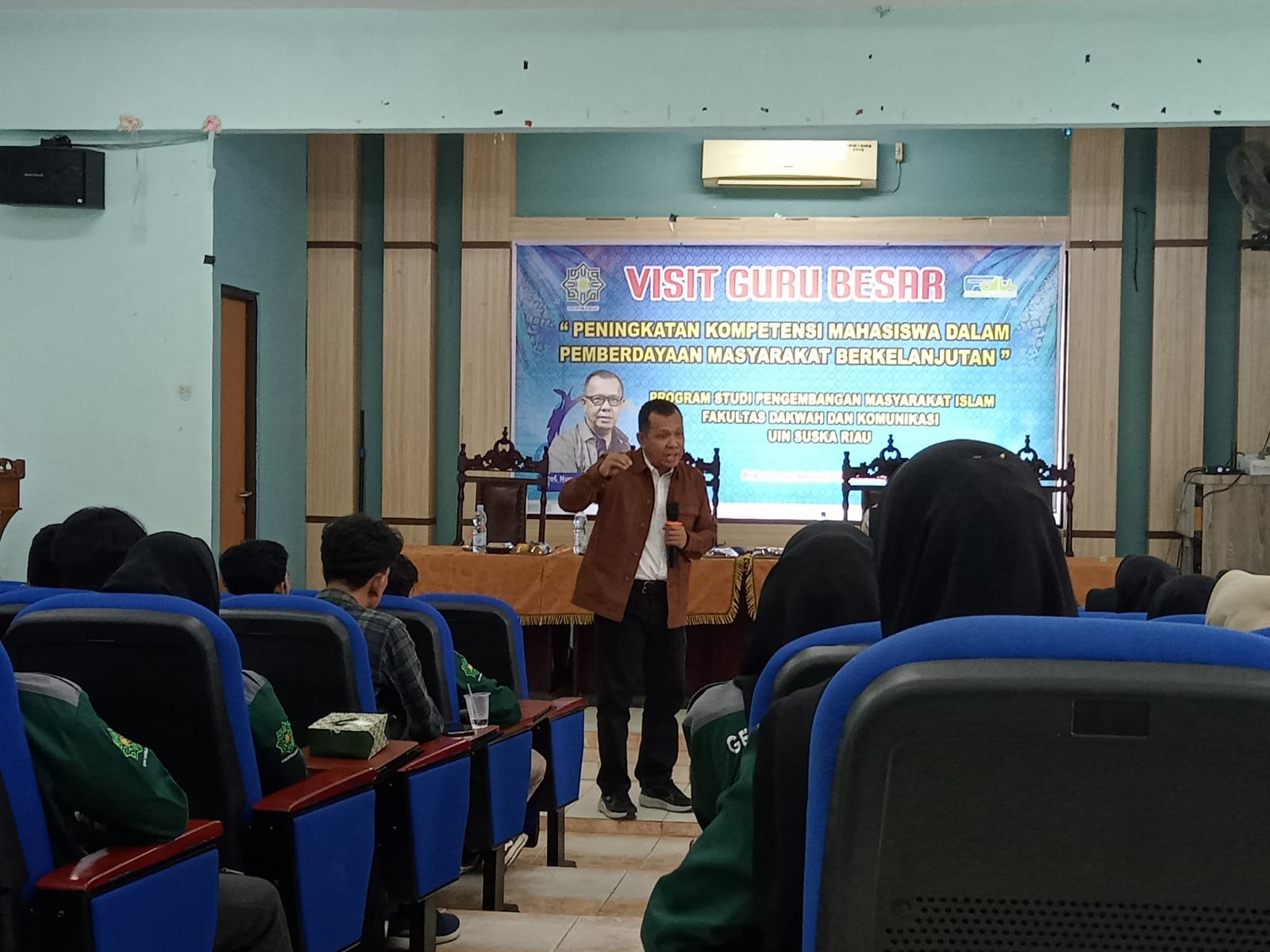 Prodi Pengembangan Masyarakat Islam UIN Suska Riau melaksanakan kegiatan Visit Guru Besar Pada Senin (23/10/23). Kegiatan dilaksanakan di Gedung Teater Fakultas Dakwah dan Komunikasi. Hadir sebagai narasumber kegiatan ini Dekan Fakultas Sains dan Teknologi UIN Imam Bonjol Padang, Selaku Praktisi Pemberdayaan Masyarakat Prof. Nurus Shalihin, M.Si., Ph.D. Kegiatan ini diikuti oleh 68 peserta yang terdiri dari mahasiswa dan dosen Prodi Pengembangan Masyarakat Islam. Tema yang dibahas dalam kegiatan ini yakni “Peningkatan Kompetensi Mahasiswa Dalam Pemberdayaan Masyarakat Berkelanjutan”.